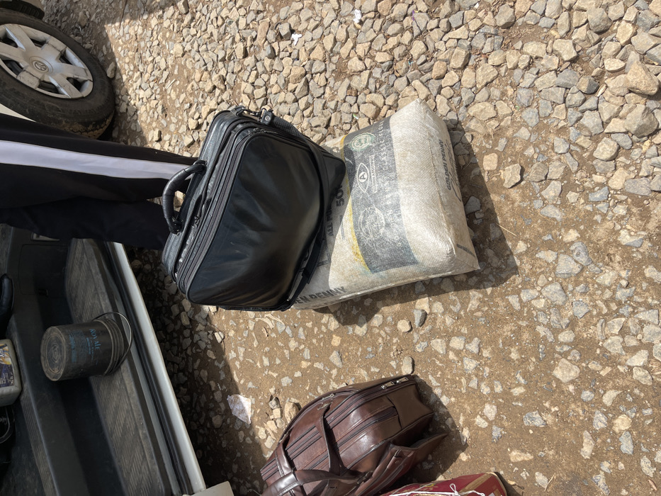 The scene is an outdoor setting on unpaved ground composed of dirt and scattered gravel, illuminated by direct sunlight creating distinct shadows. A white vehicle, appearing to be a van or SUV, occupies the upper left quadrant, with its passenger-side door open, revealing a black running board. A silver-colored hubcap is visible on the vehicle's front-right wheel. On the running board, inside the vehicle, a blue cylindrical container marked "ROYALE" is present, along with a partial view of another smaller container. On the ground, a large beige woven sack, identified by visible labeling as "GOLDEN PENNY CLASSIC FLOUR" and indicating a "50Kg" weight, is positioned centrally. A black, soft-sided briefcase or laptop bag with a top handle and shoulder strap rests directly on top of this flour sack. To the left of the sack, a dark brown, leather-like duffel bag with a zipper is situated on the ground. A small section of a red object is visible at the extreme left edge of the frame. The lower body of an individual is partially visible standing near the vehicle and the black briefcase. The person is wearing dark trousers with a prominent white vertical stripe on the outer seam of the left leg, and dark shoes. The specific location within the city of Jos, Nigeria, cannot be determined from the provided visual evidence.