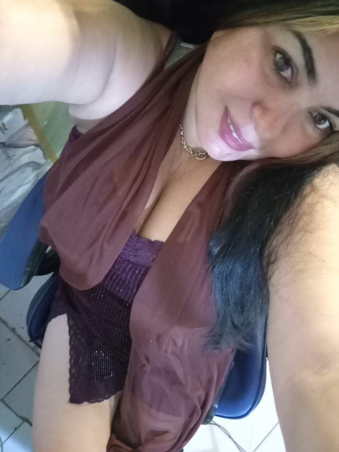 The image depicts a female individual in an indoor setting. She is positioned leaning to her right, looking directly at the camera with a slight smile and her head tilted. Her dark hair, featuring lighter highlights, is visible. She wears a gold-toned chain necklace. Her attire consists of a dark purple, possibly sequined or glittered, top with lace detailing, and a sheer, reddish-brown shawl or wrap draped over her shoulders and chest. A portion of her bare upper left arm is visible in the foreground. She appears to be seated in a dark blue chair, parts of which are visible. The background is softly out of focus, revealing a light-colored tiled floor and indistinct patterns, possibly from bedding or furniture, behind her. The precise location within the city of Juan Griego, Venezuela, is not discernible from the visual information provided in the image.