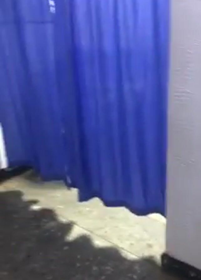 sparsely lit corridor. On one side are blue curtains hanging from white supports. The floor is speckled. There are doors and a picture on the wall further down the corridor. Towards the end of the video, the camera focuses on a gray wall.
