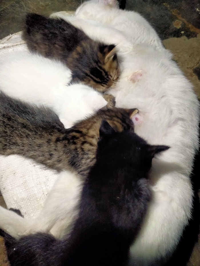 - "A white cat lies on its side surrounded by kittens" by FM-3Xduo1, licensed under CC BY 4.0
