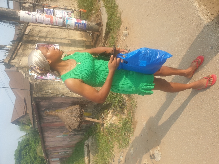 A woman stands on a paved surface wearing a green dress, red flip-flops, and a head covering. She holds a blue plastic bag in her left hand. Buildings and a utility pole covered with posters are visible in the background. A thatched object sits near a weathered building. Sunlight creates a long shadow on the pavement near the woman.