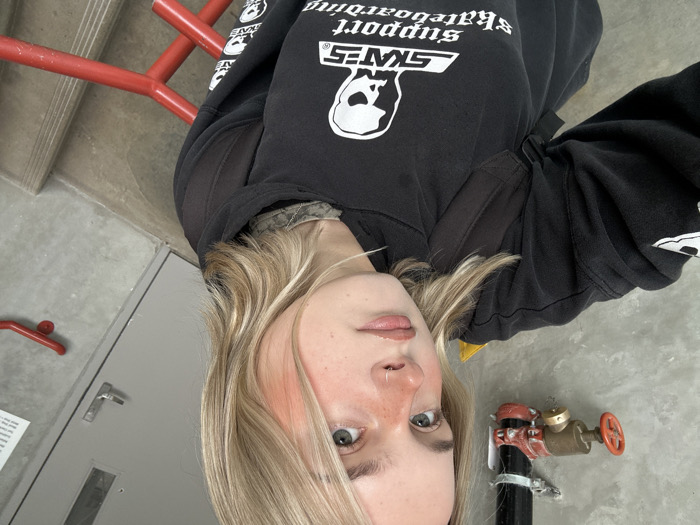A young adult female is depicted in a selfie, positioned indoors within what appears to be a utilitarian building stairwell or service area. She has blonde hair, fair skin with freckles on her nose and cheeks, light-colored eyes, and a small ring in her left nostril. Her cheeks display a noticeable reddish tone. She is wearing a black hooded sweatshirt with a white skull graphic that reads "SKATES support skateboarding" on the front, and additional skull graphics on the sleeves. A black backpack is worn over her shoulders. The background features a grey concrete wall on the left, with a vertical black pipe attached to it, including a brass-colored valve with a red handle. A yellow object is partially visible behind her left shoulder. To the right, a light grey metal door with a silver handle is present. Below and to the right, red metal handrails are visible, indicating the presence of concrete stairs descending. The floor is also grey concrete. The specific location within Vancouver, Canada, is not discernable from the provided image.