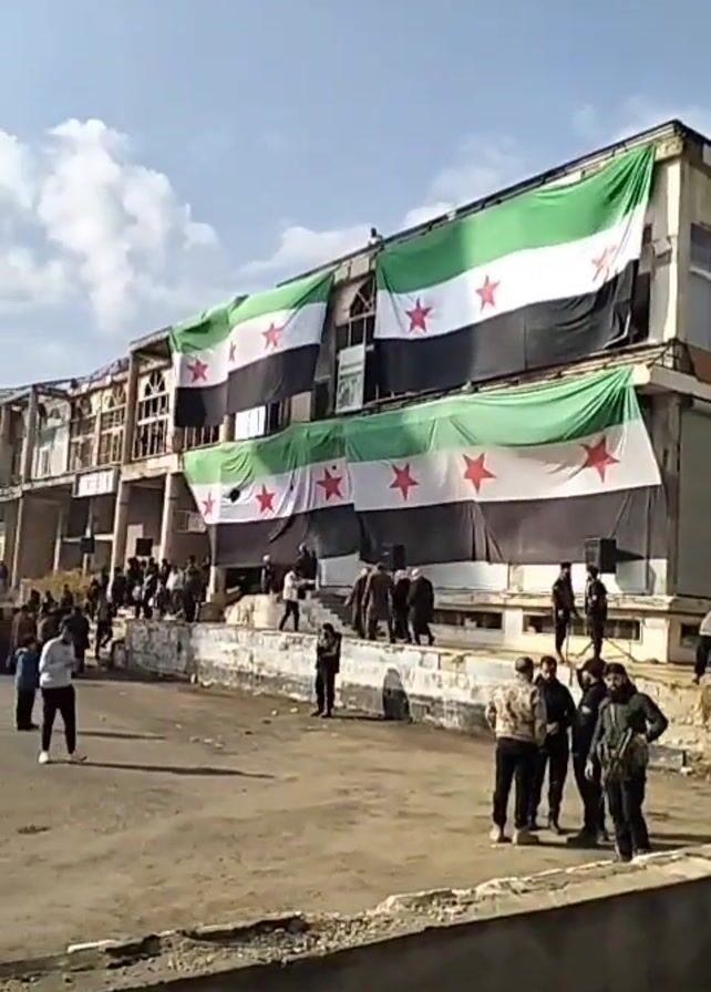 - "The video depicts a group of people gathered in front of a building adorned with multiple Syrian flags" by FM-4RDN43, licensed under CC BY 4.0