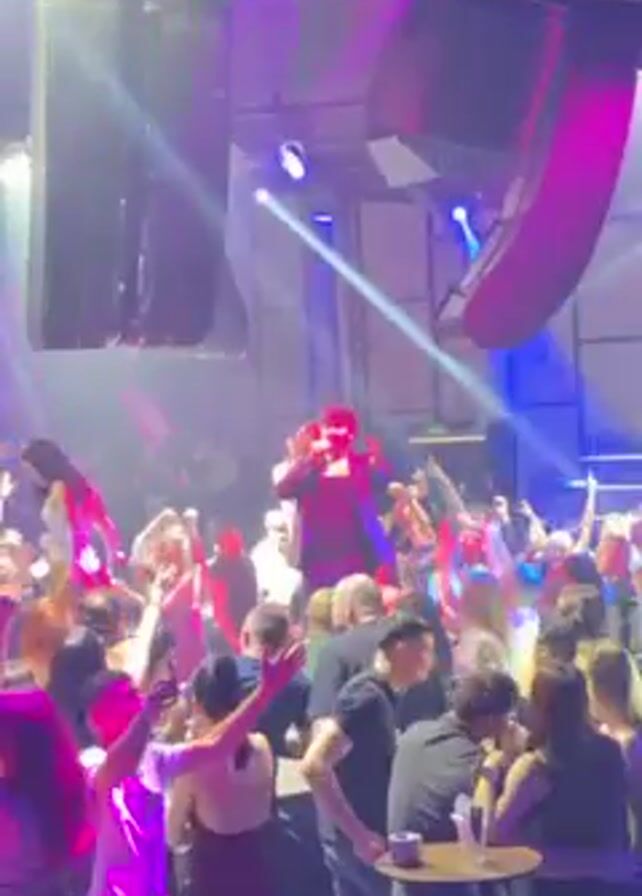A dimly lit nightclub is filled with people. A male performer in a black outfit sings into a microphone on a raised platform. Two female dancers wearing short, sparkly outfits dance alongside him. The audience dances and raises their hands in the air, some filming the performance on their phones. The nightclub has a high ceiling with exposed ductwork and lighting rigs. Colored stage lights illuminate the scene.