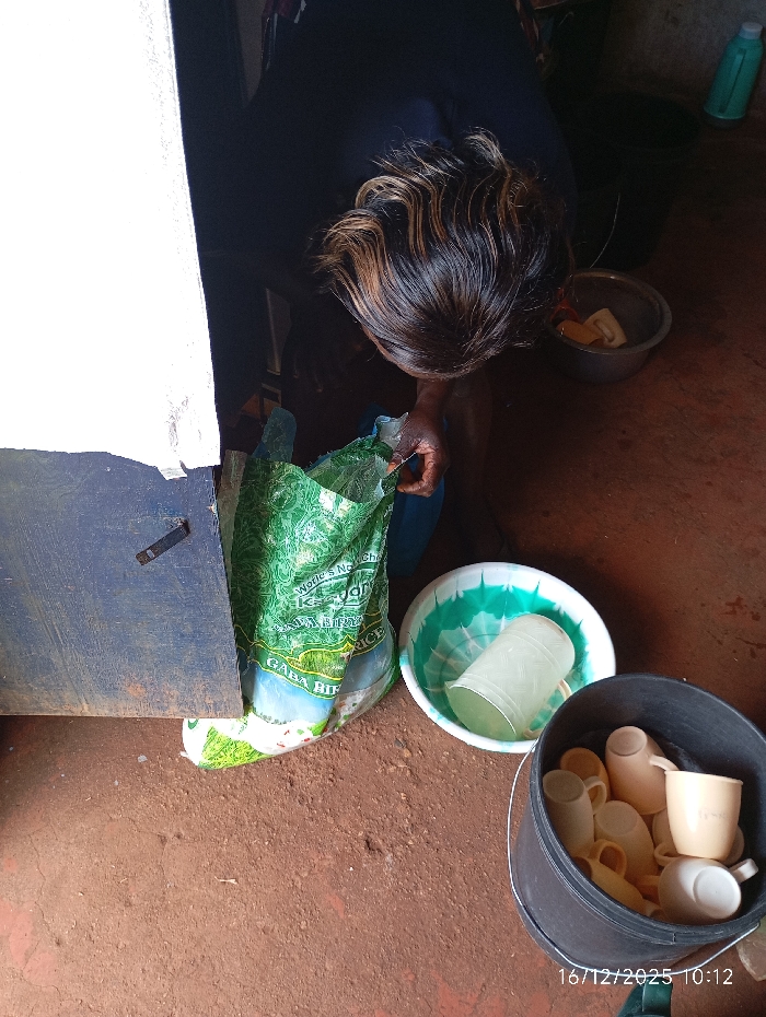 The image depicts an indoor scene in Ewuaso Oonkidong'i ward, Kenya, featuring one individual and various domestic objects on an earthen floor. A person, observed from a high angle looking down, has dark brown hair with lighter, possibly reddish-brown, highlights, pulled back from their face. They are dressed in a dark-colored, long-sleeved garment and are bent forward, actively reaching into a large green and white woven plastic sack with their right hand. The sack, positioned near a dark blue wooden surface with a metal latch, bears partial text including "World's No.1" and "GABA BIR...RICE." The floor is a reddish-brown, uneven, packed dirt surface. To the right of the sack, a white plastic basin with a green striped rim holds a translucent white plastic jug. Adjacent to this, a black plastic bucket contains approximately ten light-colored (beige or cream) ceramic mugs or cups with handles. In the background, a silver-colored metal bowl containing indistinct light-colored items is visible. Further back, a dark bucket and a green plastic bottle are partially discernible. The scene is illuminated by a strong light source originating from the left, casting parts of the interior into shadow. A digital timestamp "16/12/2025 10:12" is visible in the lower right corner.