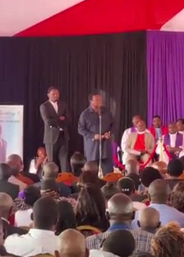 man speaking into a microphone in front of a seated audience. The speaker is wearing a dark jacket, and there is a man standing behind him to his left in a dark suit. Behind the speaker, there is a group of individuals who appear to be clergy, wearing religious robes and seated in chairs. To the left of the stage, there is a sign with text and an image of a person, although the details are not fully discernible. The audience consists of people of diverse ages and appearances. They are all facing the stage. The setting appears to be a formal event, possibly a memorial service or a public gathering, held under a tent decorated with red, white, and green fabric.
