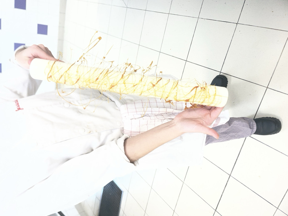 A person is depicted in a professional kitchen environment, likely in Schiltigheim, France. The individual, dressed in a white chef's jacket with "Jeannette" embroidered in red on the left chest, striped chef's pants, and black non-slip shoes, holds a white cylindrical object vertically. A white and red checkered towel is tucked into their attire on the left side. The cylinder is adorned with fine, amber-colored spun caramel threads and strands, which are meticulously wrapped around and protrude from its surface. The person's right hand grips the top of the cylinder, while the left hand supports its base. The background features a clean, brightly lit space with large light-colored square floor tiles and dark grout lines. A black mat is visible on the floor to the upper left. The wall behind the subject is light-colored, displaying several dark blue square decals or tiles arranged in a uniform pattern.