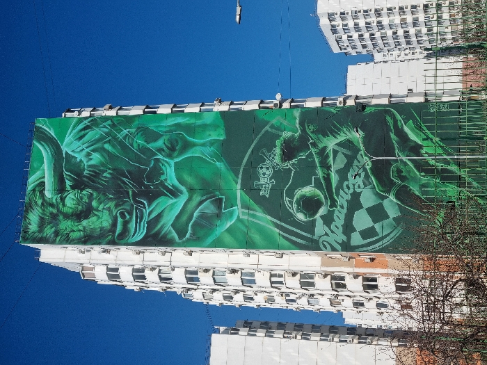 The image displays a tall, light-colored residential high-rise building located in a residential area within Krasnodar, Russia. A large-scale mural, rendered predominantly in various shades of green, covers a significant portion of the building's prominent side facade. The upper section of the mural features a detailed depiction of a bull's head and upper body, characterized by visible musculature and large horns, conveying a sense of dynamic motion. Below the bull, the mural illustrates a male soccer player in mid-action, positioned to kick a soccer ball with his right foot. A circular emblem containing a checkerboard pattern and the Cyrillic word 'Краснодар' (Krasnodar) is integrated into the lower part of the mural. The building itself is equipped with numerous uniformly arranged windows and multiple externally mounted air conditioning units. In the immediate foreground, a dark green metal fence runs horizontally, partially obscured by bare deciduous tree branches. Additional white multi-story residential buildings are visible in the background, under a clear, bright blue sky.