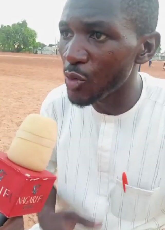 A man is being interviewed outdoors. He is dark-skinned, has short hair, a trimmed beard, and is wearing a light-colored, striped, button-down shirt. He appears to be speaking to someone off-camera who is holding a red microphone with the words "ARIF FA" and "NAGARIF" printed on it. The man is holding a red pen in his shirt pocket. The background shows a sandy or dirt-covered area with some buildings and trees in the distance. Other people can be seen in the distance playing a game on the dirt field.