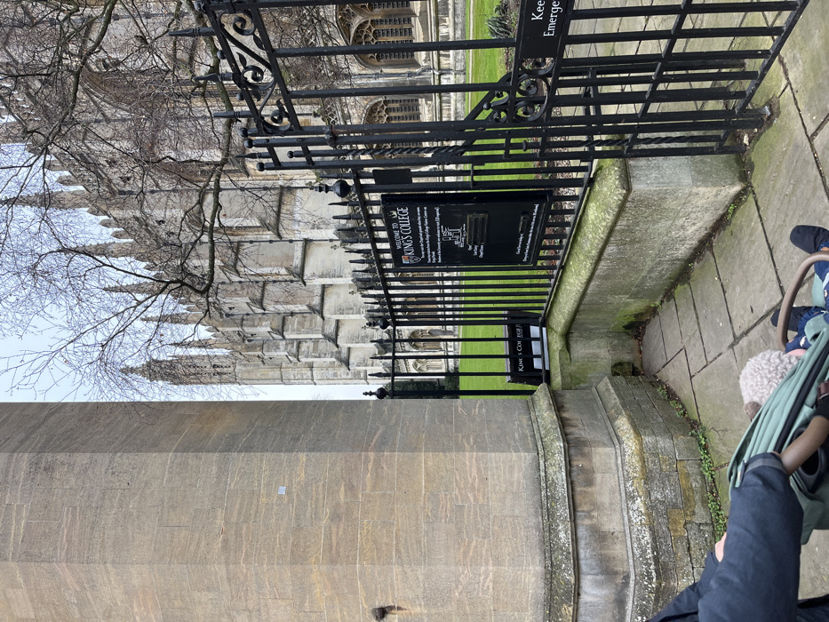 The image captures a ground-level view outside King's College in Cambridge, United Kingdom, on an overcast day. In the immediate foreground, the upper body and arms of an individual in a dark jacket are visible, pushing a light green stroller. A small child, wearing a light brown, textured hat and dark blue clothing, occupies the stroller. The ground is paved with light grey flagstones. To the left, a large, rectangular stone column, composed of beige-toned masonry with horizontal striations and signs of weathering, occupies a significant portion of the frame. To the right of this column, a black wrought-iron fence with vertical bars and ornamental scrollwork runs horizontally. Attached to the fence is a black sign with white text, reading "WELCOME TO KING'S COLLEGE" and displaying the college crest, along with visitor information and a simplified map. A smaller black sign, also reading "KING'S COLLEGE," is visible lower down on the fence. Behind the fence, a vibrant green lawn is visible. In the background, the imposing Gothic architecture of King's College Chapel rises prominently. The chapel exhibits numerous stone buttresses, pointed arch windows with detailed tracery, and a series of pinnacles or spires along its roofline. Bare tree branches, devoid of leaves, are scattered across the midground and background, partially obscuring the chapel against a pale, uniformly grey sky.