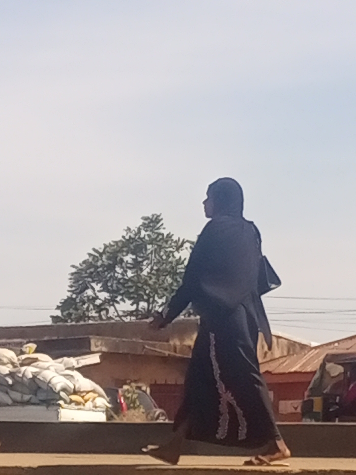 An individual is depicted in daylight, walking from right to left across an elevated concrete surface in Jos, Nigeria. The person, appearing female, is dressed in a dark, full-length garment, possibly a hijab and abaya, with light-colored vertical embroidery or patterns on the lower left side of the dress. Dark sandals are worn on the feet. A dark shoulder bag is carried on the left side. In the midground to the left, a stack of large, light-colored sacks, likely filled, rests on a lower structure. Behind the sacks and the walking individual, a tree with green foliage is prominent. Further in the background, several buildings with reddish-brown corrugated roofs are visible. Overhead, utility lines stretch across the frame against a clear, pale blue sky.