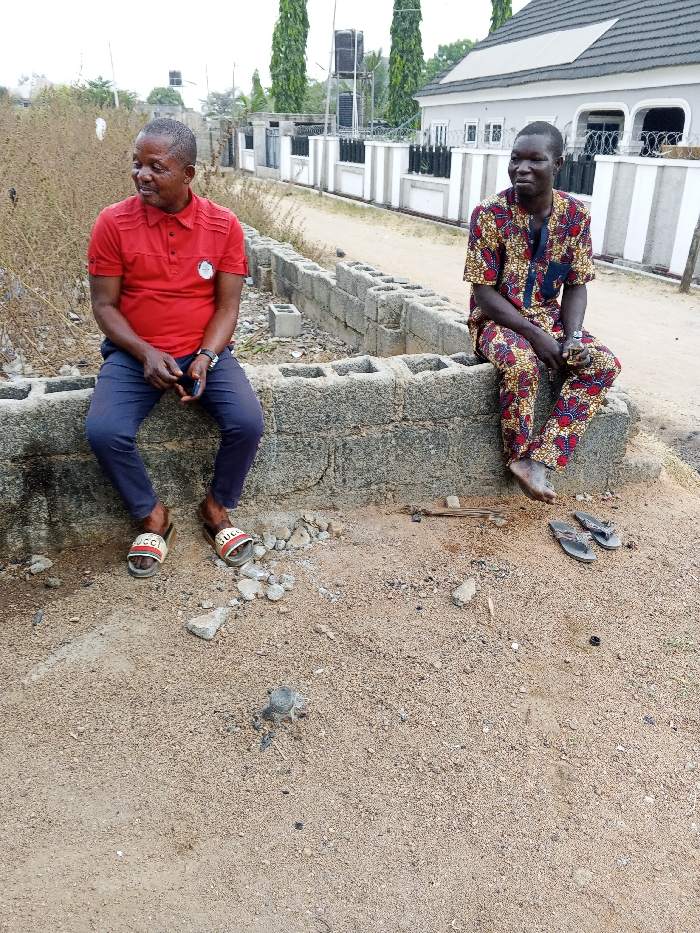 Two men sit on a concrete block. The man on the left wears a red shirt, dark pants, and Gucci sandals. He holds a phone. The man on the right wears a colorful patterned outfit and sits barefoot, with sandals nearby. They are outside. A fence and a white house with a gray roof are visible in the background. The ground is sandy. Small pieces of concrete litter the area.