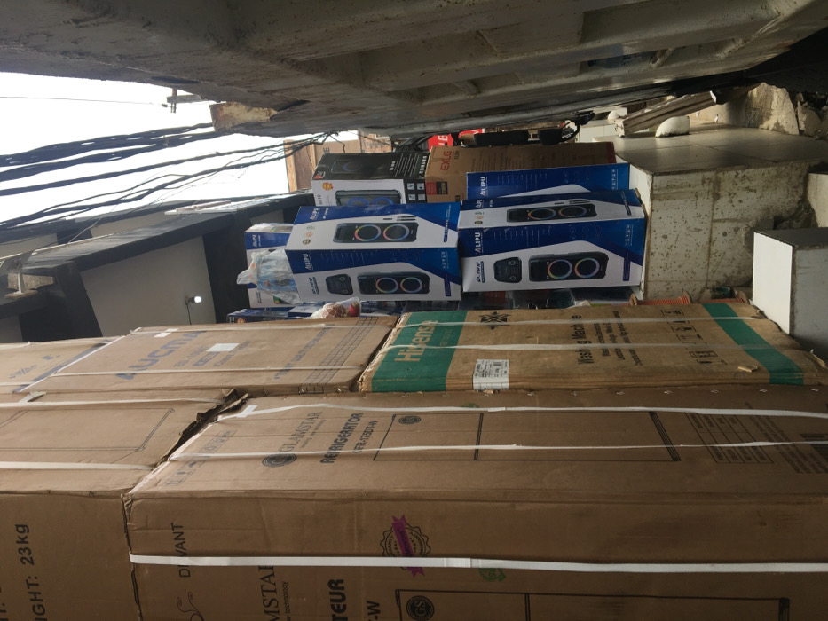 The scene depicts a cluttered, narrow exterior passage between buildings in Ojo, Nigeria, consistent with a commercial or storage area