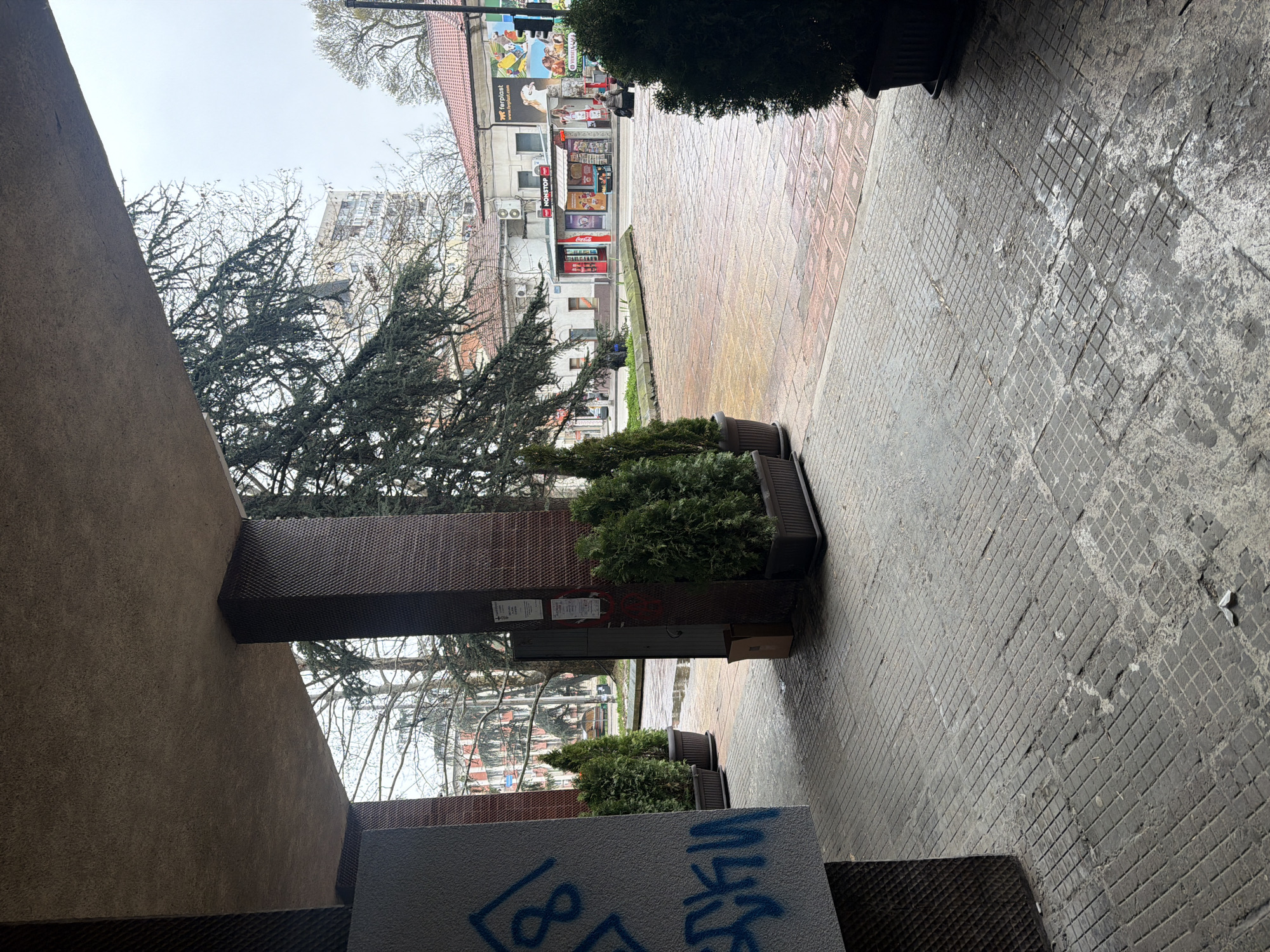 n urban scene in Pleven, Bulgaria, likely taken from an alcove or covered walkway. The ground is paved with two types of rectangular paving stones, with a clear dividing line down the center. The paving stones on the right are a uniform gray with a grid pattern. The stones on the left are a mix of red and gray hues, and are more smooth. Along the boundary between the paving stones, there are potted evergreen shrubs. Behind the shrubs, a storefront is visible, with advertisements, posters, and a Coca-Cola refrigerator. Above the store, there are residential floors. The sky is overcast. The foreground shows part of a building structure, with a textured beige wall and sections covered in brown patterned tiles. There is some blue graffiti on the wall nearest the camera. A few bare trees are visible, but generally the environment seems to be an urban walkway with retail and residential areas present.