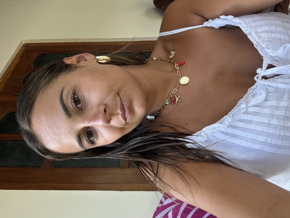 The image displays a close-up, eye-level portrait of a female individual located in Mirissa, Sri Lanka. The subject has a tanned complexion, dark brown hair appearing damp, and brown eyes, looking directly at the camera with a neutral expression. She wears a white sleeveless top featuring vertical pleats, lace trim along the neckline, and a tie-front detail. Jewelry includes a gold-colored hoop earring visible on her right ear and a gold-colored chain necklace. This necklace is adorned with several charms: an irregular white pearl, a cluster of red cherries with green leaves, a gold-colored starfish, a textured oval gold-colored pendant, and a red chili pepper. A small nostril piercing is visible on her left nostril. The background consists of a light-colored wall and a dark wooden door or window frame with vertical panels. A white fabric with magenta stripes is partially visible on the far left.