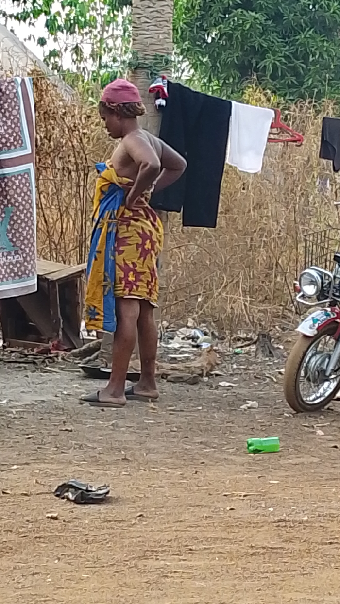 A woman wearing a pink cap and a colorful cloth stands with her hands on her hips. Laundry hangs on a line in the background, near a motorcycle. A small table sits to the left, and a pile of dry brush fills the space around her. Discarded items, including a crumpled piece of foil and a green object, litter the ground. The surface beneath appears sandy and uneven.