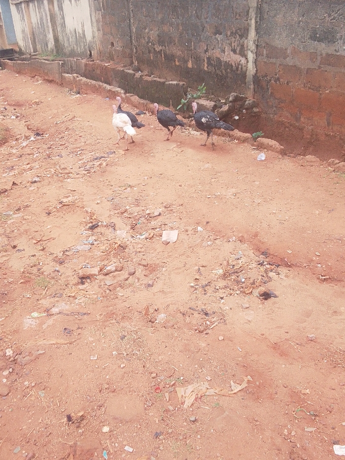 dirt road with three turkeys walking along it. The road is littered with debris. A concrete wall and drainage ditch border the road. The location is likely a residential area in Nsugpe, Nigeria, given the context.