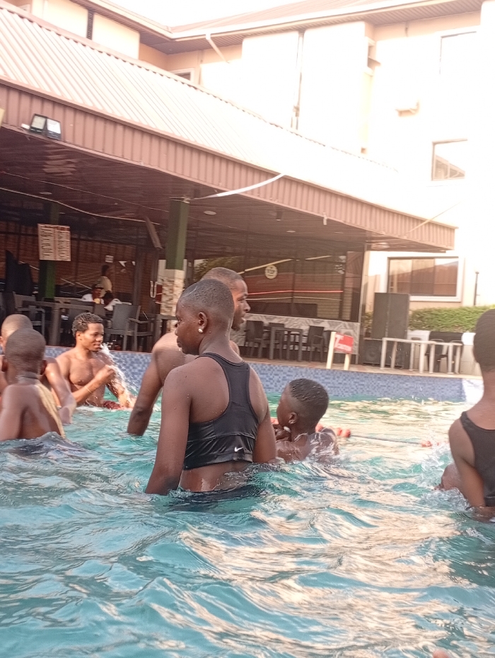 Several people are enjoying a pool on a sunny day. A young woman with short hair is standing in the center, wearing a black sports bra. Other individuals, including a young boy, are partially submerged in the water. The pool is surrounded by tables and chairs, suggesting an outdoor dining area. A building with a brown roof is visible in the background, possibly a hotel or resort.