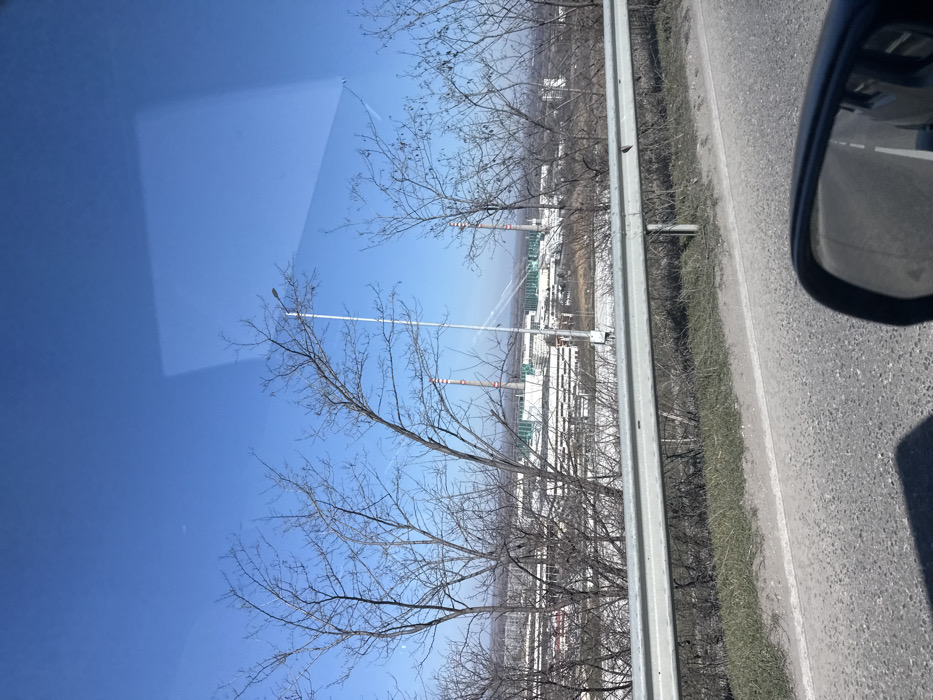 The image depicts an exterior scene on a clear, sunny day, captured from the interior of a moving vehicle. The primary subject is an industrial complex, identified as the Kozloduy Nuclear Power Plant in Kozloduy, Bulgaria, visible in the mid-ground and background. In the foreground, the paved surface of a road, likely asphalt, occupies the bottom quarter of the frame, bordered by a white line. Above the road, a metal guardrail with two horizontal bars extends across the width of the image. Sparse, dry grass and dormant deciduous trees with visible branches are situated behind the guardrail, on an elevated embankment. A streetlamp pole, white and slender, stands vertically among the trees on the right side. The industrial complex beyond the trees features numerous white buildings, some with green architectural elements. Multiple tall, cylindrical structures, identifiable as industrial chimneys or cooling towers, rise above the complex, with at least two prominently displaying red and white bands. Faint, linear white trails are visible in the distant blue sky above the facility. The bottom right corner of the image includes a partial view of a vehicle's side mirror, reflecting a portion of another vehicle. A faint, rectangular reflection from the vehicle's interior is visible in the upper right quadrant of the sky. No individuals are visible in the scene.