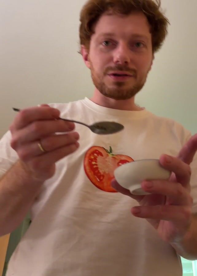 A man in a white t-shirt with a tomato on it holds a small bowl in his left hand and a spoon with something white on it in his right hand