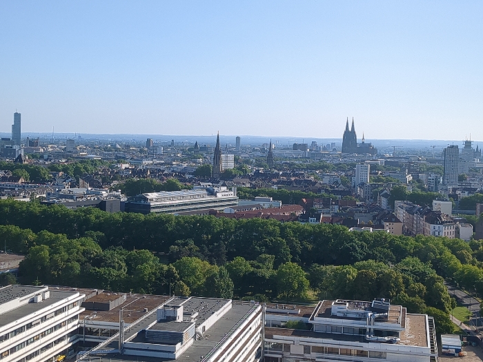 A cityscape under a bright blue sky features numerous buildings interspersed with lush green trees. In the distance, a cathedral with twin spires stands prominently amidst the urban sprawl. Modern buildings with flat roofs are visible in the foreground. Tall structures, including a skyscraper, punctuate the horizon. The scene captures a blend of nature and urban development.