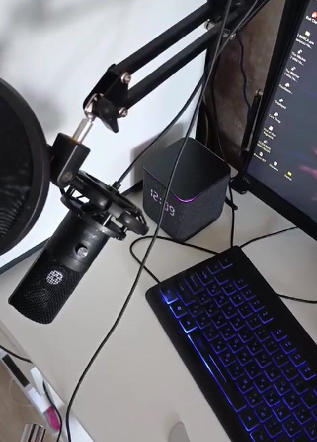 close-up, top-down view of a small section of a desk, focused on computer and audio equipment. A black microphone is mounted on a black articulated arm with a pop filter. A small, dark gray speaker cube is behind the microphone. To the right, there is a black keyboard with blue backlighting and part of a computer monitor displaying various icons. Numerous cables are visible, connecting the devices. The desk surface is white. Music is playing in the background.