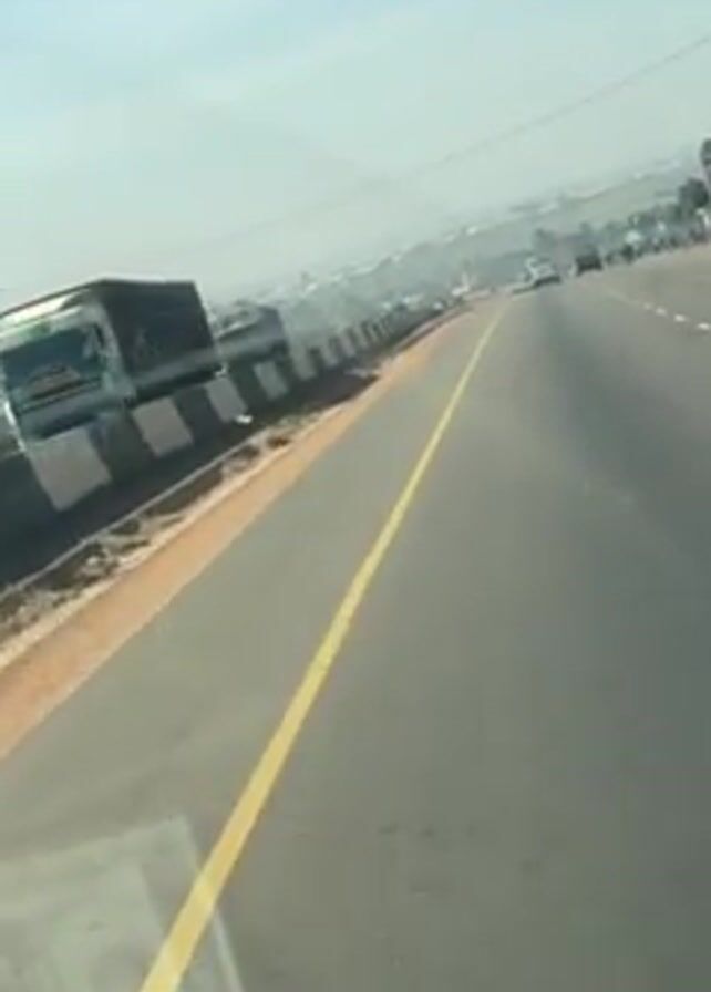 The video is taken from inside a moving vehicle, likely a van, driving on a paved road with a yellow line dividing lanes. The sky is blue, and the day appears sunny but hazy. In the distance, a city or town is visible, obscured by the haze. On the left side of the road, there's a concrete barrier with black and white markings, and beyond it, there's a truck parked. Other vehicles, including cars and a motorcycle, are visible on the road ahead. Palm trees are visible on the right side of the road. The interior of the van is visible, including the dashboard, steering wheel, and rearview mirror.