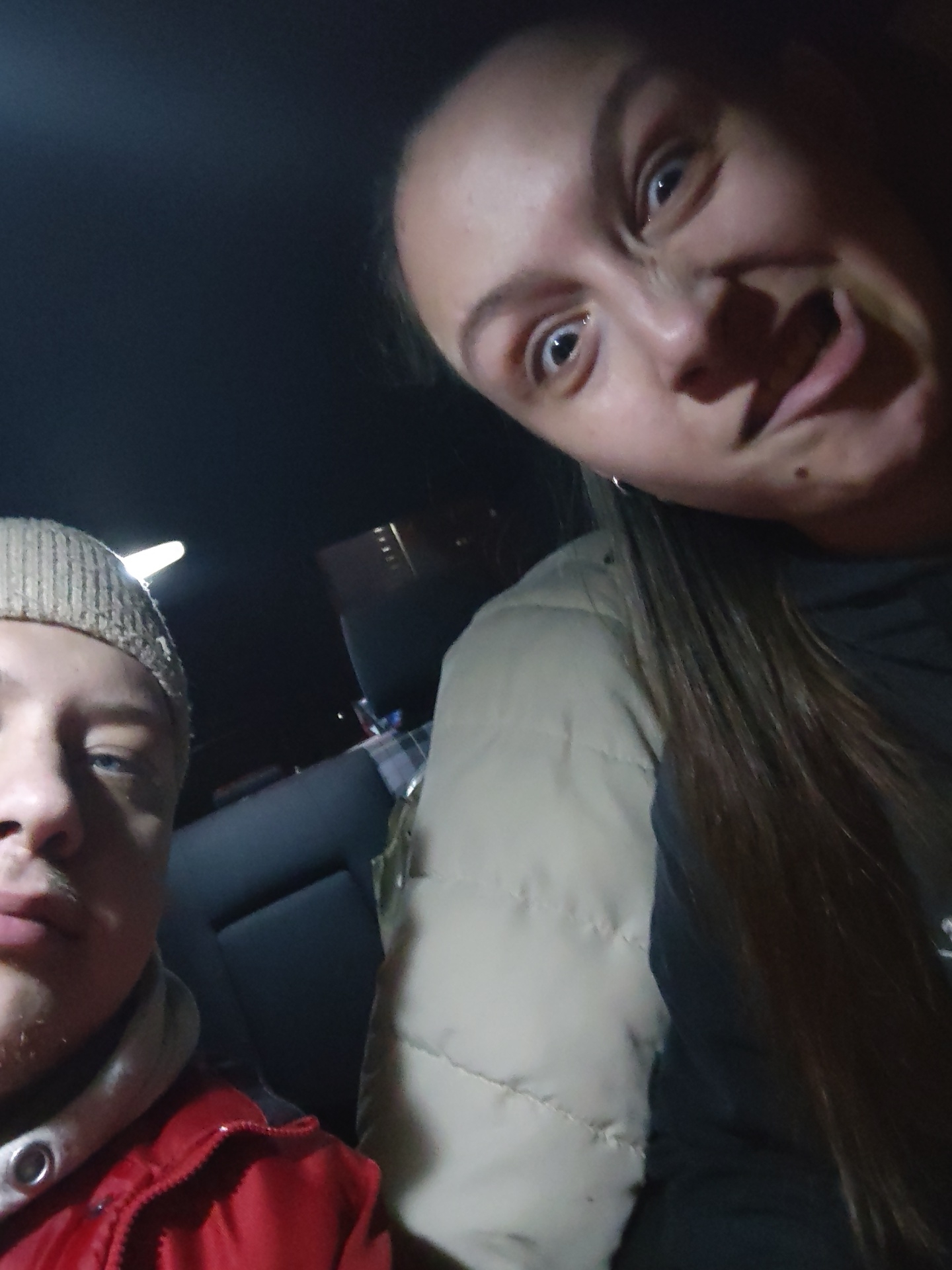 Two individuals are visible in the image, likely captured indoors, possibly inside a vehicle