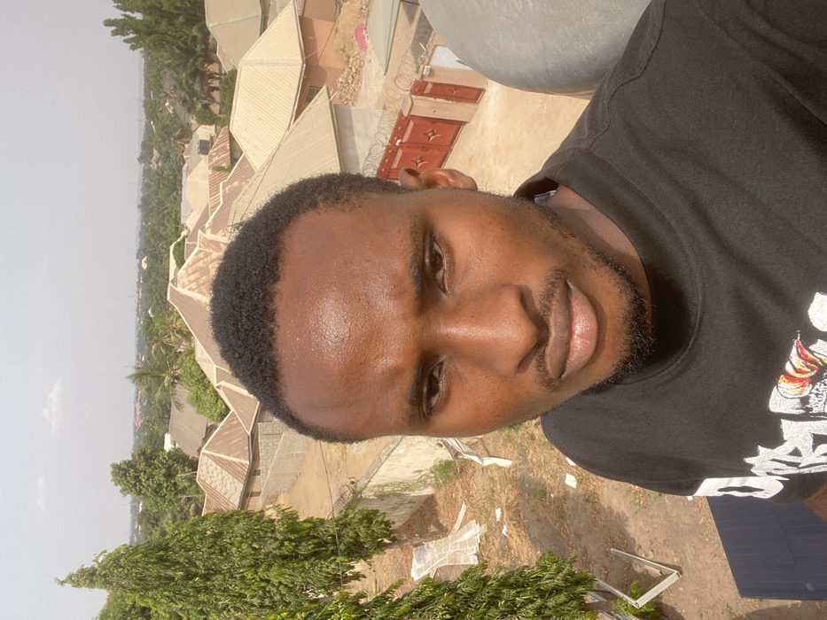 A self-portrait image depicts a young adult male with dark skin, short, dark curly hair, and a trimmed beard and mustache