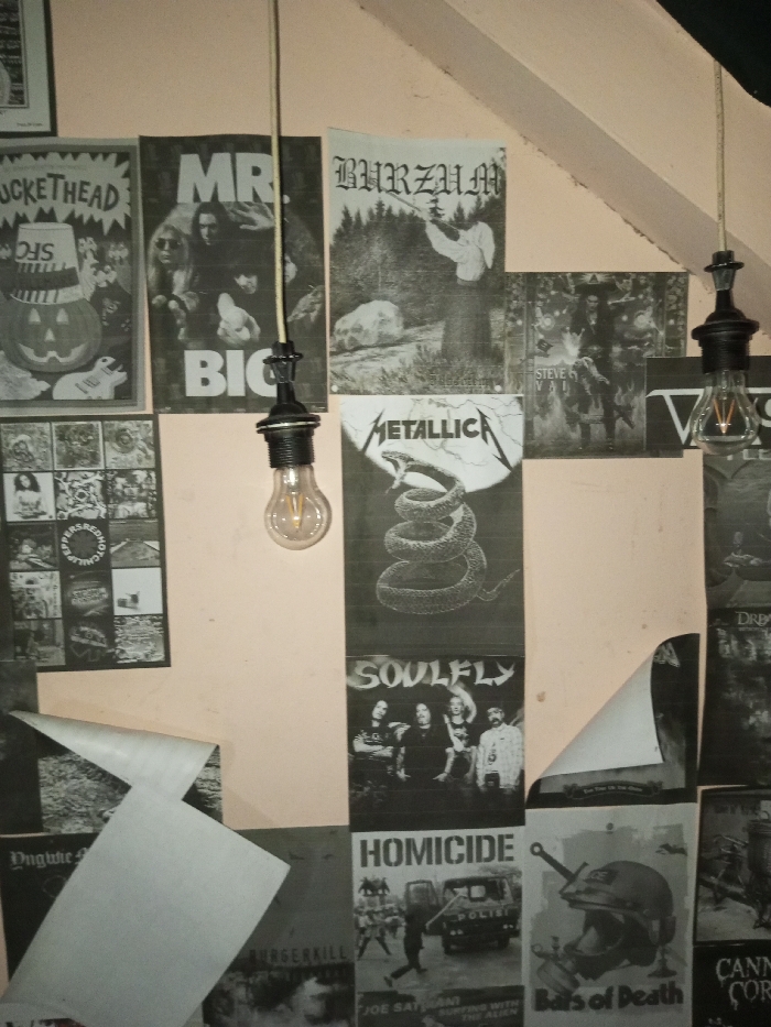 A wall covered with various black and white band posters dominates the scene. Notable bands include Buckethead, Mr. Big, Burzum, Metallica, and Soulfly. Other visible posters are Homicide, Burgerkill, Bats of Death and Cannibal Corpse. Two vintage-style light bulbs hang from the ceiling, adding a unique aesthetic to the display of musical artistry. The wall appears to be painted a light pink or peach color, contrasting with the dark posters.