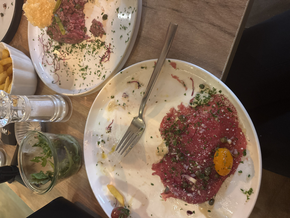 This image depicts a dining table scene inside a restaurant in Bruges, Belgium. On a light wooden table, two partially consumed meals are presented. In the foreground, a white, slightly oval plate contains a substantial portion of beef carpaccio. This dish is composed of thinly sliced raw red meat, garnished with finely diced red onion, capers, chopped green herbs (likely parsley), grated white cheese, and a single raw egg yolk positioned near the bottom left of the meat. A silver four-tine fork rests diagonally across the center of this plate, pointing towards the upper left. The plate shows evidence of prior consumption, with scattered food particles and oil residue. To the upper right, a smaller, round white plate holds the remnants of a beef tartare dish. A significant portion of minced raw red meat, topped with green herbs and a large, golden, textured crisp, remains on the plate. This plate also exhibits scattered food residue, including red strands and green herbs. Other items on the table include a clear glass jar containing a small amount of green leafy salad or herbs, positioned to the left of the tartare plate. Adjacent to this jar, a tall, clear glass salt grinder filled with white crystalline salt stands upright. Further back, behind the tartare plate, a white ceramic bowl contains a small quantity of golden french fries. A dark object, possibly a personal electronic device, is partially visible on the far left edge of the table. A grey, patterned dish or coaster is situated behind the salt grinder. No individuals are present in the frame, but the partially consumed meals indicate active dining.