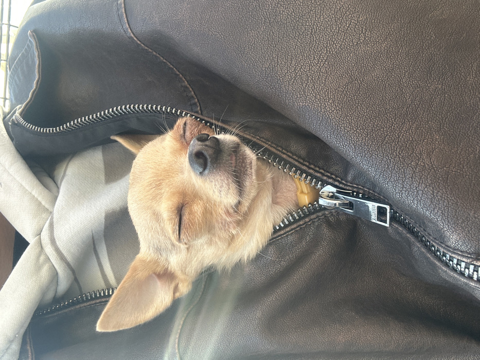 - "A close-up image depicts the head of a small, light-brown, short-haired dog, consistent with a Chihuahua, emerging from a partially zipped dark brown leather jacket" by FM-babw32, licensed under CC BY 4.0