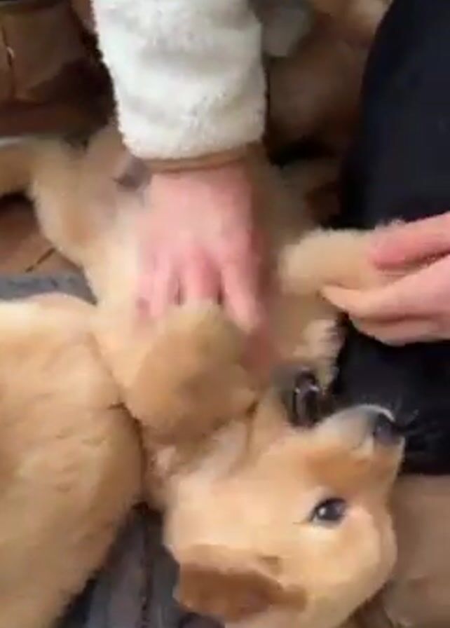 A person in a white fuzzy jacket is sitting on the ground, surrounded by a group of light brown golden retriever puppies. The person is petting the puppies on their bellies, which are exposed as the dogs lie on their backs. A pair of brown boots is visible near the person and the puppies. The floor appears to be gray and covered with a cloth.