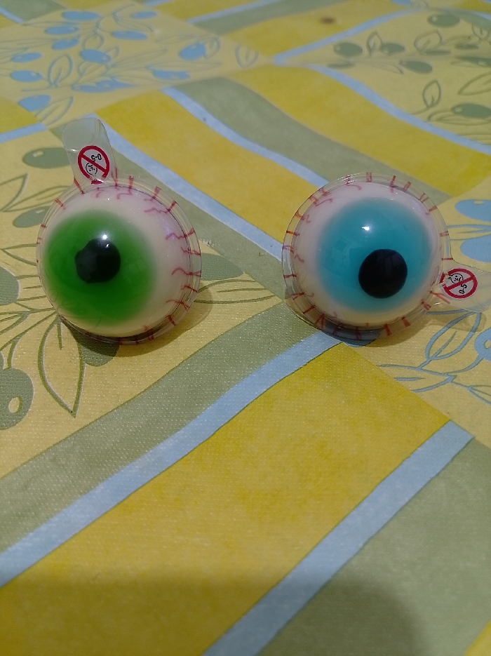 - "Two eyeball-shaped candies sit on a yellow and blue striped tablecloth with a floral design" by FM-5n8Vg2, licensed under CC BY 4.0