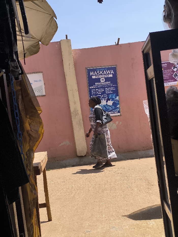 The image depicts a bright, sunlit outdoor scene in Samaru, Nigeria, likely a street or market area. A woman is walking from left to right across a light brown, unpaved ground surface. She is wearing a long, patterned dress or gown with dark short sleeves and dark sandals. She carries a black shoulder bag on her left shoulder and a grey, possibly canvas, tote bag in her left hand. The background features a reddish-pink stucco wall, which shows some wear and includes a vertical cream-colored column or beam. Mounted on this wall is a prominent blue and white sign that reads "WELCOME TO MASKAWA POS CENTER" with "Monpoint" and additional service details visible below, including "POS" terminal imagery and a phone number. To the left of this main sign, a smaller white sign with blue text, partially obscured, shows "DALLATU". Above the wall, the sky is clear and light blue. In the left foreground, part of a market stall or structure is visible, including a beige umbrella-like canopy, dark fabric or clothing hanging, blue chain-links, and a wooden bench or table. On the right foreground, another dark, partially visible structure frames the scene. Shadows of the woman and objects in the foreground are cast on the ground, indicating direct overhead sunlight.