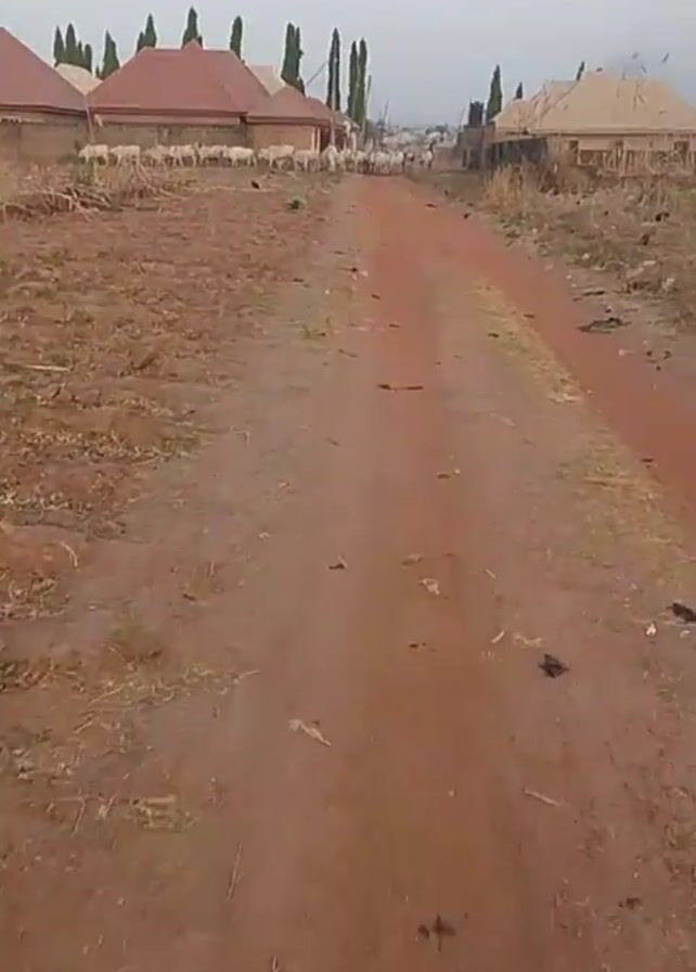dirt road in a rural area. On either side of the road is dry, scrubby land. There are buildings in the background, appearing to be houses with red roofs. A large group of white animals, likely sheep or goats, are gathered near the houses. The sky is overcast. The camera appears to be moving slowly along the road.