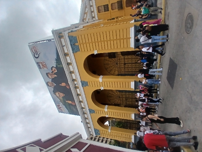A long line of people stands outside a yellow, arched building with a large banner on its roof featuring three men. The sky is cloudy. A drain or manhole cover is visible on the ground. The foreground shows the edge of a maroon-and-white structure. People in line are wearing various clothing, including red shirts, white shirts, and jeans.