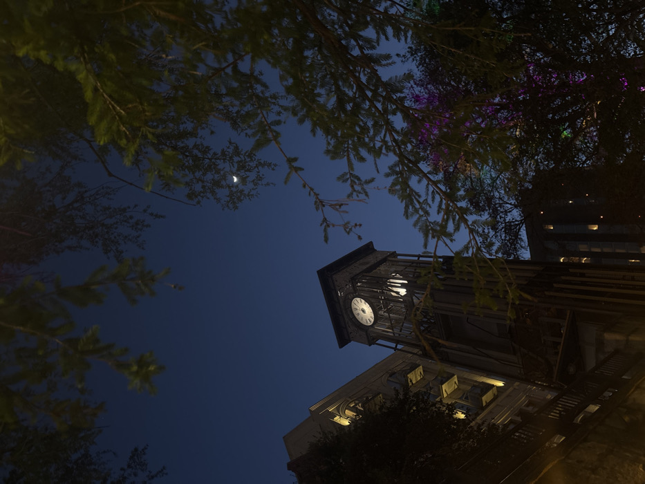 This is a nighttime vertical outdoor photograph capturing a section of the San Antonio River Walk area in San Antonio, Texas, USA. The central feature is a tall, dark-framed clock tower, illuminated from within, displaying an analog clock face with Roman numerals. To the immediate left of the tower, a multi-story building with a light-colored facade presents several illuminated windows and balconies. The upper portion of the image shows a dark blue twilight sky with a crescent moon visible in the upper right quadrant. The foreground and right side of the frame are characterized by dark green tree foliage, while some background trees display artificial purple and green accent lighting. No individuals or specific activities are visible within the scene. The image is composed from a low-angle perspective looking upwards.