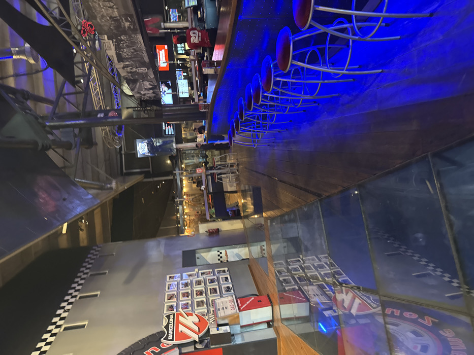 bar area with a long wooden counter. The counter is illuminated by blue LED lights, which are reflected on the floor. There is a row of bar stools along the counter. In the background, there are other tables and chairs, as well as a wall with a large sign that says "Barcelona." The location is in Sant Feliu de Llobregat, Spain, at coordinates 41.395 latitude and 2.034 longitude. There are no people in the image. The only actions occurring are the blue LED lights illuminating the area. The image has a perspective that is looking down the length of the bar counter toward the back of the bar. The counter is made of wood, and the stools have a metallic finish. The floor is made of wood planks and has a glass surface in the foreground. The walls are painted gray and the ceiling has exposed beams. There are a few black and white checkered tiles on the walls. There is an empty red garbage can in the lower left corner of the image. This is a forensic, matter-of-fact description of the scene.