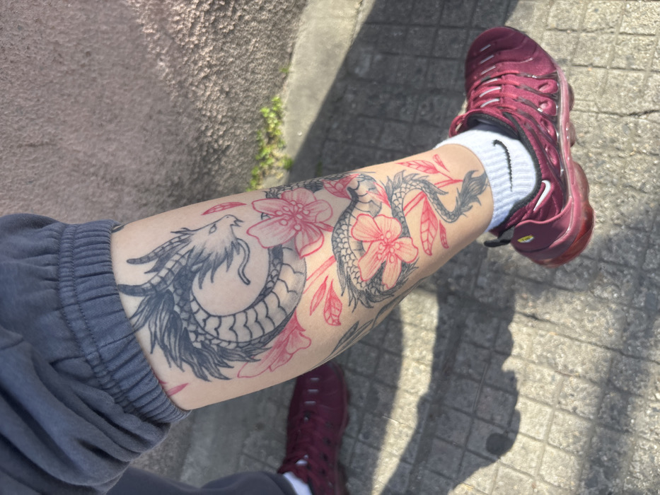 A close-up, eye-level image depicts a person's lower right leg and foot in the city of Yambol, Bulgaria. The leg is adorned with a large tattoo featuring two black and grey dragons intertwined with numerous pink cherry blossoms and associated red foliage. The individual wears grey sweatpants with an elastic cuff, white ankle socks displaying a black Nike swoosh logo, and a maroon Nike Air VaporMax Plus sneaker. The subject stands on a grey-tiled or paved outdoor surface, with distinct shadows from the leg and foot indicating strong sunlight. A textured, light-colored wall and sparse green vegetation are visible in the background.