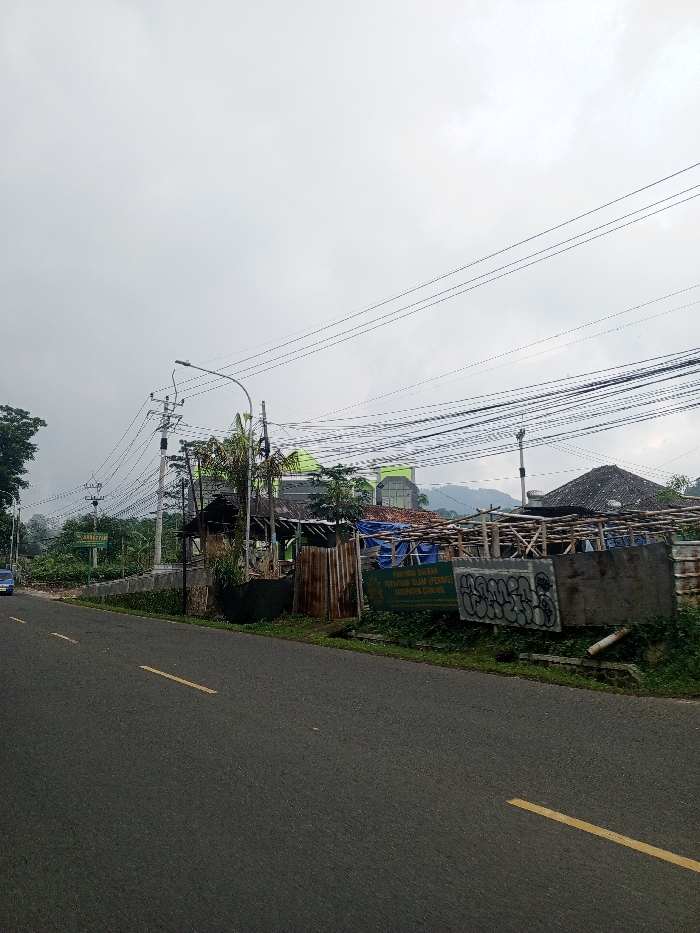 The scene depicts a roadside view under an overcast, light grey sky. An asphalt road, marked with two parallel dashed yellow lines, occupies the foreground and extends into the mid-ground, where a dark blue vehicle is partially visible on the far left, moving away from the viewer. On the right side of the road, multiple utility poles support numerous black electrical and communication cables strung horizontally across the frame. A street light with an attached lamp extends over the road from one of these poles. Behind the poles and cables, a series of structures and dense green vegetation are present. A significant building with a prominent green roof and facade is visible further back. Closer to the road, there is a smaller, dark-roofed structure and a larger, temporary construction of wooden scaffolding draped with blue tarpaulins. A fence of rusty corrugated metal sheets stands between the road and these structures. Adjacent to the road, a green sign with white text is displayed, reading "PIMPINAN DAERAH PERHIMPUNAN ISLAM (PERSIS) KABUPATEN CIANJUR," indicating the location is within Cianjur Regency, Indonesia. Another rectangular panel, possibly concrete, featuring white graffiti, is positioned closer to the road. Hazy hills are discernible in the distant background. No people are visible within the scene, and no discernible actions or interactions are depicted.