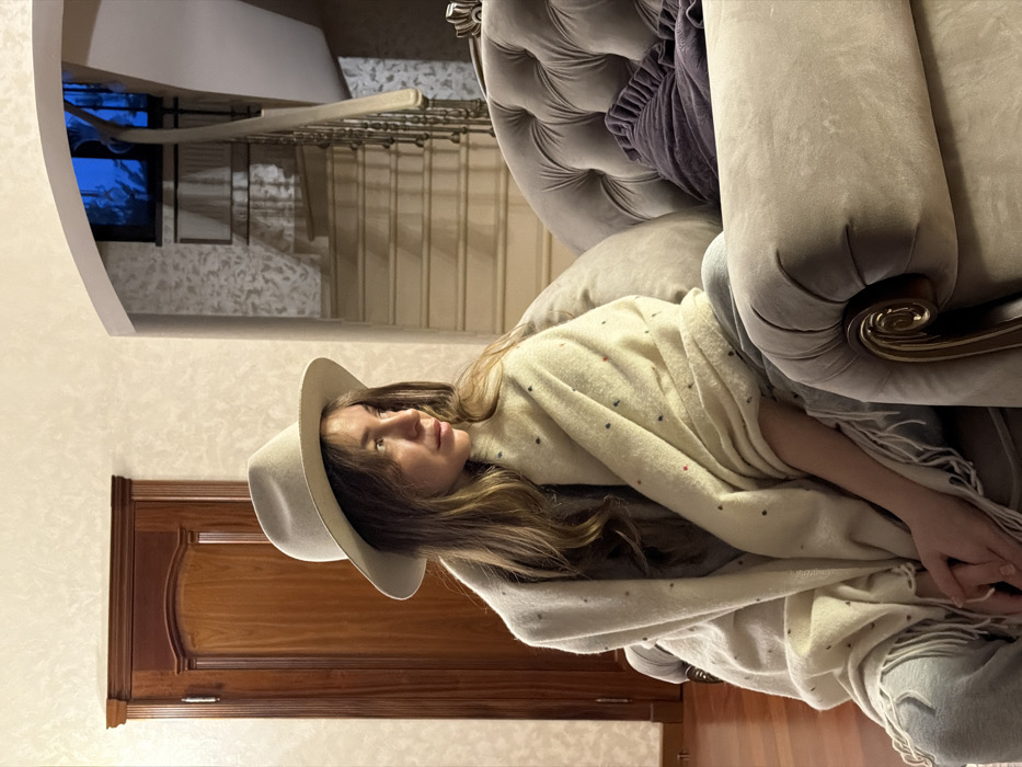 A woman wearing a cream-colored hat and patterned shawl reclines in a plush grey armchair. She gazes upwards with a serene expression. A wooden cabinet stands behind her to the left, while an ornate staircase stretches away in the background. The room is decorated in muted tones, creating a cozy and peaceful atmosphere. The photograph is rotated ninety degrees counterclockwise.