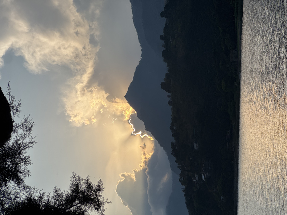 A landscape view features a body of water reflecting golden light on the right side. Mountain silhouettes dominate the center, contrasting sharply with the bright, sunlit clouds behind. The sun peeks through a gap, creating radiant beams. Silhouetted tree branches frame the lower left, adding depth to the scene. The overall mood is peaceful and serene.