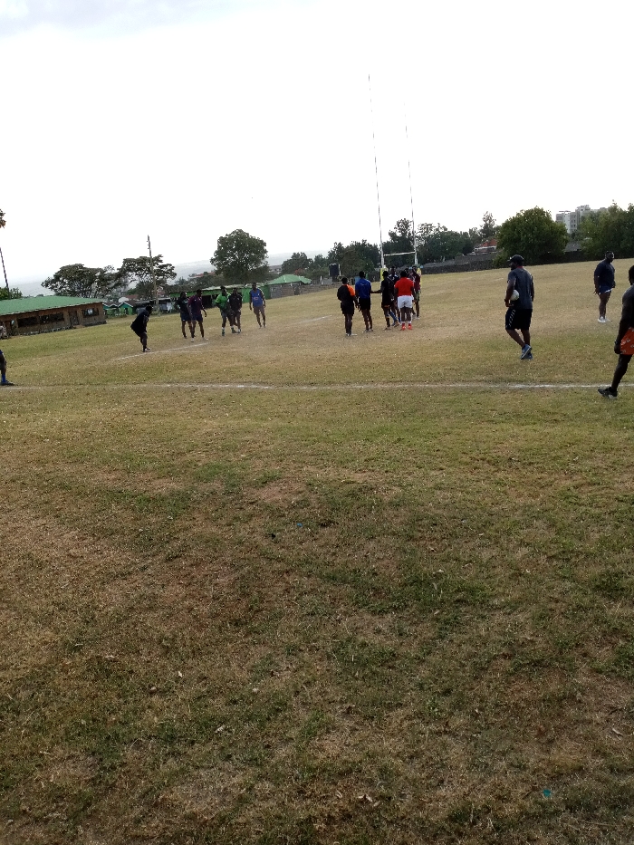 A sports field, likely for rugby, shows a group of people engaged in activity near the goalposts. Some individuals are standing and observing, while others seem to be practicing or training. Buildings and trees are visible in the background against a cloudy sky. The field is grassy with some dry patches, and white lines mark the playing area.