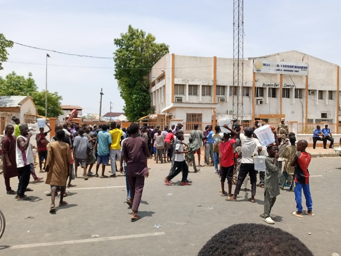 group of people gathered in front of a building in Jimeta, Nigeria (latitude: 9.279, longitude: 12.453). The building appears to be a business center, with signage indicating "Business Bay Complex". Several people are carrying plastic buckets, possibly in relation to the business. Some individuals are interacting with each other while others are standing alone or in small groups. Two individuals in uniform appear to be security personnel. The scene is set on a paved street, with trees visible in the background. The sky is clear and the overall ambiance suggests a daytime setting.