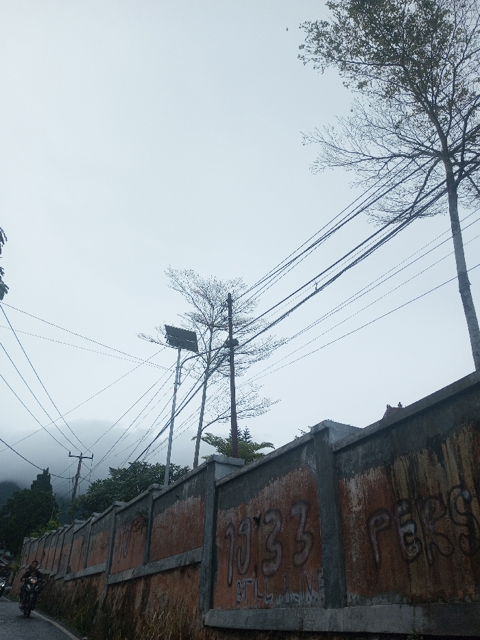 A low-angle exterior view depicts a street scene in Babaliya Mal., India, under an overcast sky. A segmented concrete wall, discolored with brown and orange tones and bearing graffiti including "1933" and "9TILL ALIVE", occupies the right side of the frame. Multiple utility poles rise from behind this wall and further into the mid-ground, supporting a dense network of overhead electrical and communication wires that crisscross the sky. One pole in the center is equipped with a solar panel. Scattered trees, some with bare branches and others with foliage, stand between the poles and extend towards the upper-right. In the lower-left, a paved road curves into the distance, with a single individual on a dark motorcycle traveling away from the viewer. The background features distant hills or mountains partially obscured by mist or clouds.
