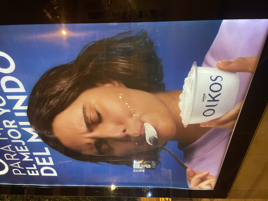 An illuminated vertical advertisement poster is captured at night on a city street in Madrid, Spain. The poster depicts a woman from the chest up, with dark, wavy hair and a light purple long-sleeved garment. Her eyes are closed, her forehead is slightly furrowed, and her mouth is open, receiving a spoonful of white yogurt. Small white flecks are visible on her left cheek. Her right hand, partially visible, holds a white Danone Oikos yogurt cup. Spanish text, partially reading "PARA... EL MEJOR... DEL MUNDO," is visible in white letters against a blue background above her head. Reflections on the poster's protective surface show elements of the surrounding urban environment at night, including streetlights and distant structures.