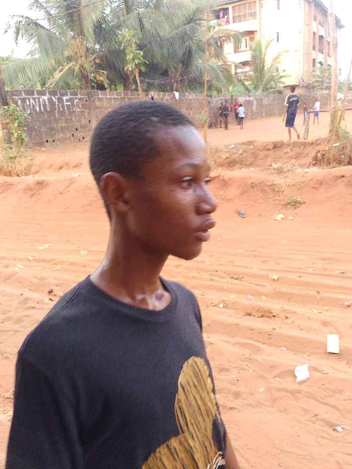 A young man stands in profile on a reddish-brown, sandy surface. He wears a dark T-shirt with a gold design. Behind him, a group of people gathers near a low wall with the faded words "UNITY F.C." visible. Beyond them, trees and a multi-story building with yellow exterior paint and multiple balconies are visible. The ground is uneven, with tire tracks. A piece of white trash is nearby.