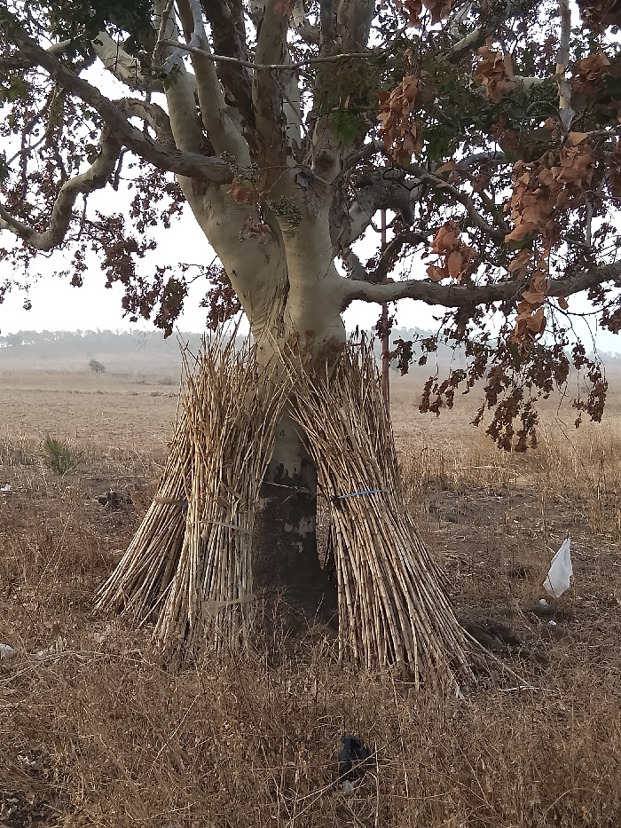 This image depicts a rural scene in Dorowa, Nigeria, characterized by a large, mature tree centrally positioned in an open, dry landscape. The tree features a light-colored, multi-trunked base and branches extending outwards, supporting sparse foliage, some of which appears dry and brown. Leaning against the tree's base are numerous bundles of dried, slender sticks or stalks, arranged to form a V-shape, with some bundles secured by blue and other colored ties. The ground surrounding the tree is covered with dry, light brown, sparse vegetation and some scattered debris, including a white plastic bag visible to the right and a dark object near the bottom center. In the background, a flat expanse of dry land extends to a hazy horizon, with a few small, distant trees visible. No people or animals are present in the frame.