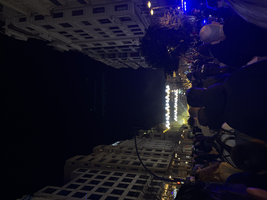 A night scene shows buildings on either side of a dark space that could be a river. White lights cascade down the center, possibly decorations or a light show. The perspective is angled, making the scene slightly disorienting. Crowds of people line the street. The upper right corner features a tree and street lamps. The overall tone is festive, yet with a hint of urban grit.